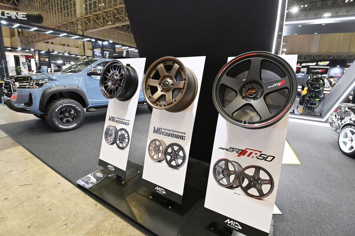 2/35巨大な「MID」ロゴの裏手に、100本を超えるホイールを積み上げたMIDホイールのブース。その光景から、品ぞろえに対する自信が伝わってくる。