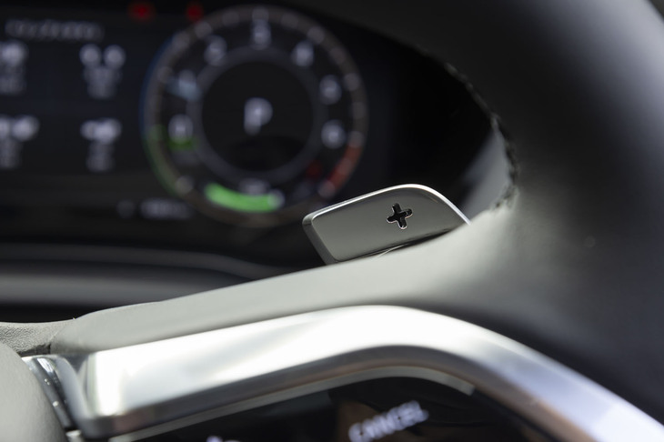 17/35センターコンソールの中央に配置されたディスプレイにパワーマネジメントが表示される。シフトパネルのスイッチ操作のほか、この画面を直接タッチして、「ハイブリッド」「セーブ」「EV」の3種類からプラグインハイブリッドの制御モードを選択することもできる。