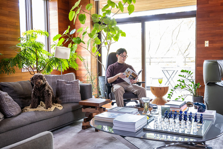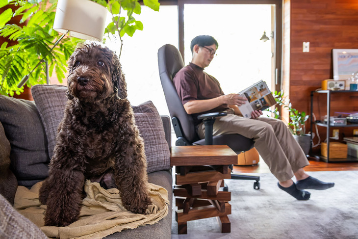 16/28「アイコン ジャワエディション」をリビングに置き、愛犬とともにリラックスタイムを過ごす神戸アレック氏。座面と背もたれが連動して可動するシンクロロッキング機構で、ゆりかごのような自然で滑らかな動きが楽しめる。