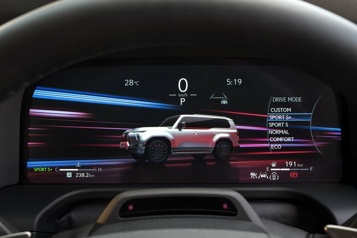 7/23「レクサスGX」には、12.3インチTFT液晶式メーター(写真)やカラーヘッドアップディスプレイが標準で装備される。