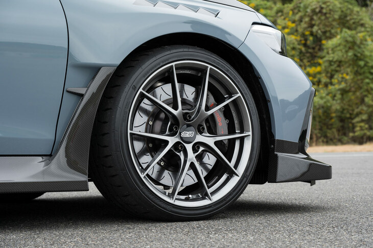 3/34鍛造ホイール「FR10」は「シビック タイプR」に用意されるものと同様のアイテム。推奨タイヤサイズは265/30ZR19だが、試乗車では「プレリュード」の純正タイヤを“引っ張って”履かせていた。