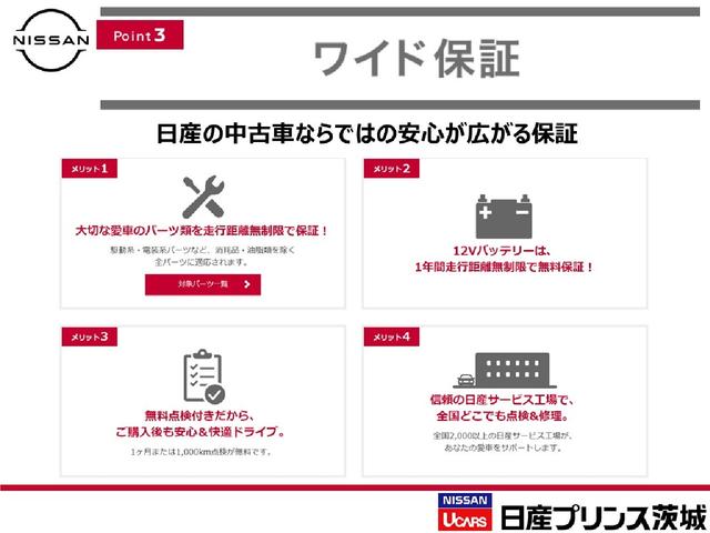 <ワイド保証>【メリット1】パーツ類を走行距離無制限で保証【メリット2】12Vバッテリー1年間走行距離無制限無料保証【メリット3】無料点検付き【メリット4】全国の日産サービス工場どこでも点検&修理