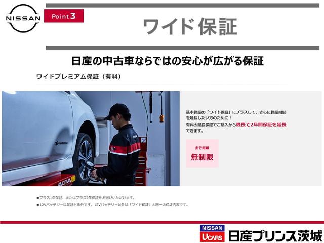 <ワイド保証>日産の販売店の中古車には、全車無料で「ワイド保証」が付いております。さらに、有料で「ワイド保証プレミアム」(延長保証)もご用意しております。