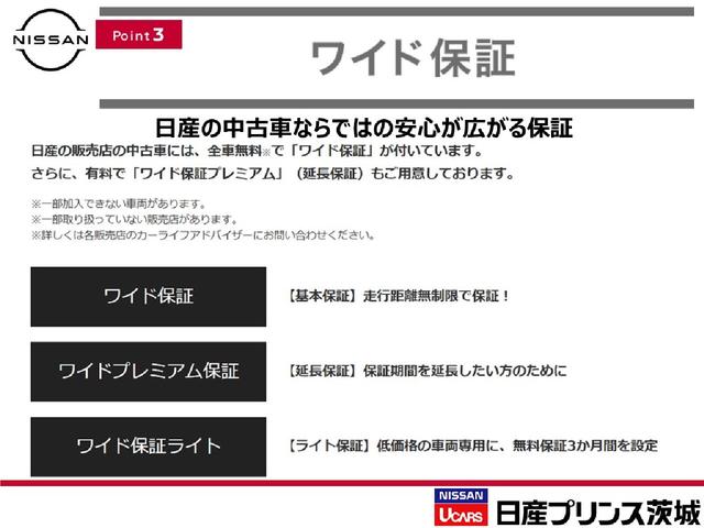 <ワイド保証>日産の販売店の中古車には、全車無料で「ワイド保証」が付いております。さらに、有料で「ワイド保証プレミアム」(延長保証)もご用意しております。