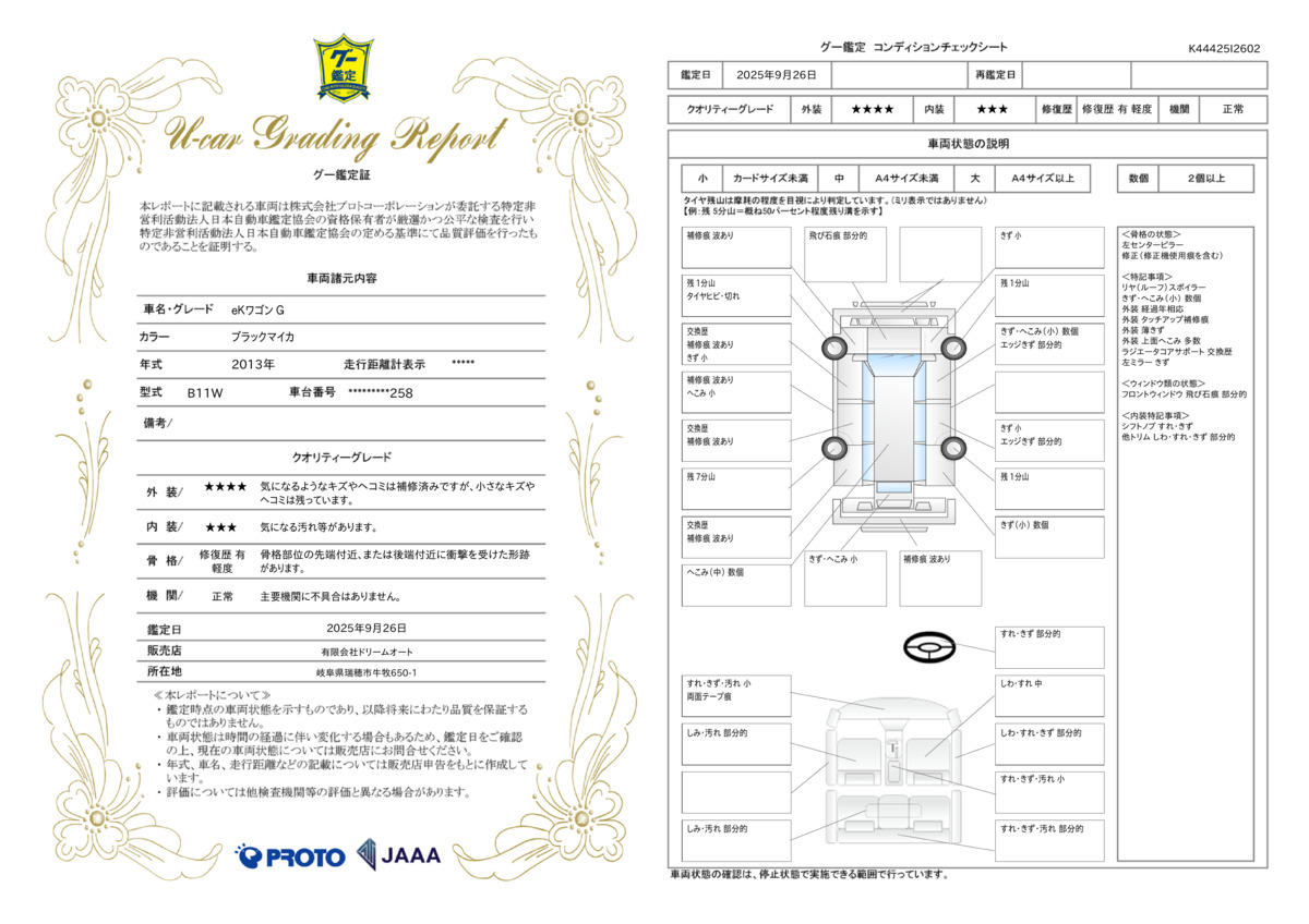 当社は全車、第三者機関NPO法人JAAAの外部鑑定書を発行しお客様にご覧いただいております。