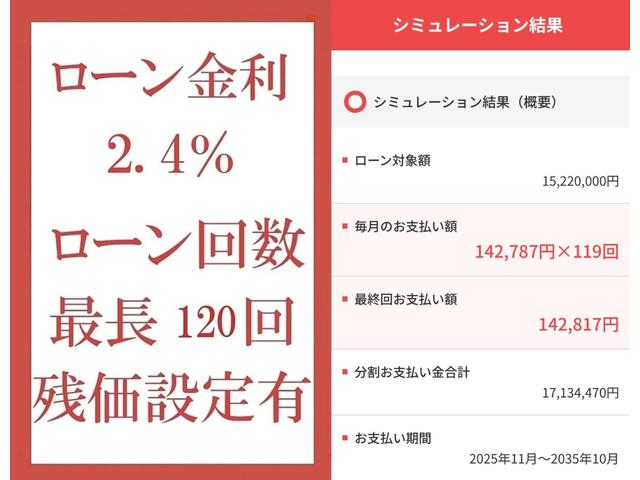 | 法定整備について | 全国納車可能。R7年12月11日迄メーカー保証付。 総額表示にはメーカー保証継承・車庫証明・名義変更・自動車税・希望ナンバー費用が含まれております。 |