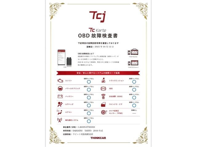 全台OBD診断機による機関チェックを実施しております。診断証明書も発行致しますのでご安心してご購入いただけます。