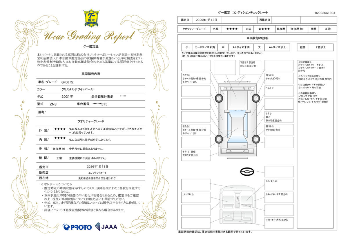 | 走行距離 | 1.7万km | 修復歴 | なし |