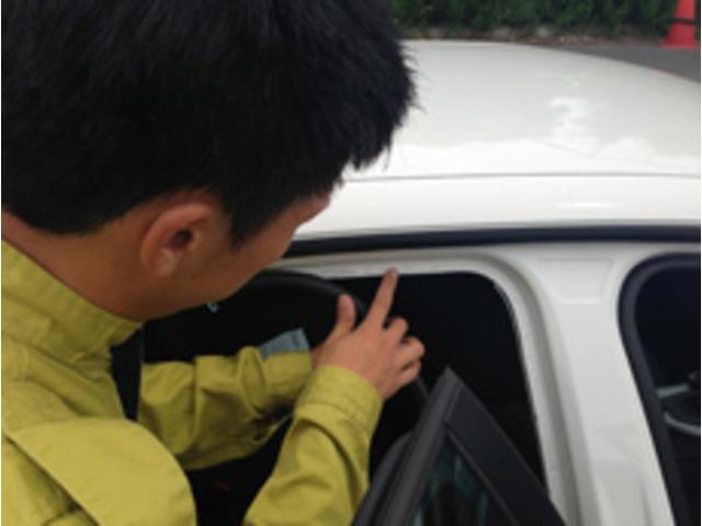 フロントガラスのチェックを行っています。飛び石によるキズ等を確認しています。