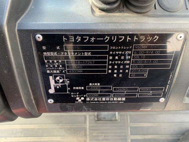 トヨタ トヨタ フォークリフト・型式8FB15・燃料タイプバッテリー・荷重1.4t・揚高4.3M・マスト3段フルフリー・アタッチメント無し