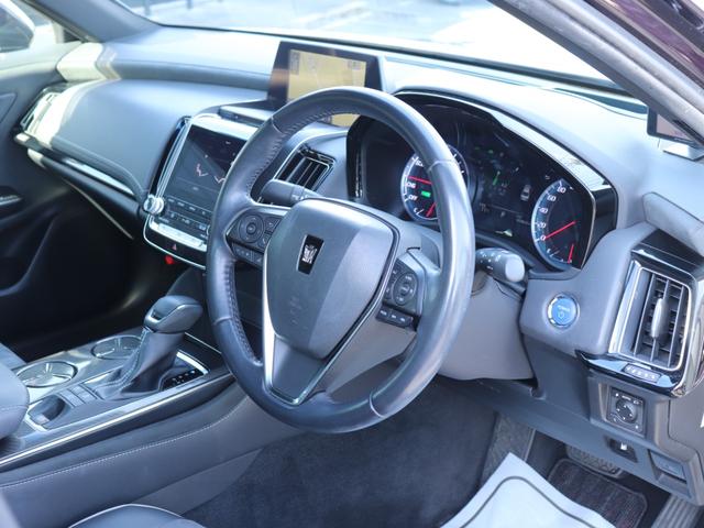トヨタ クラウンハイブリッドRSアドバンス サンルーフHUD BSM純正ナビBカメラ地デジBT音楽 追従クルコンLEDヘッドFフォグ純正18AW ETC2.0電動チルトハンドルヒーター ステコン オートハイビーム黒半革 パワーシート&ヒーター