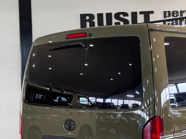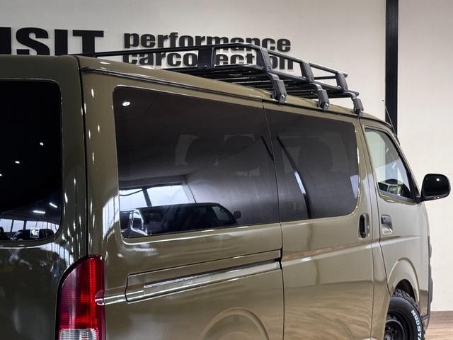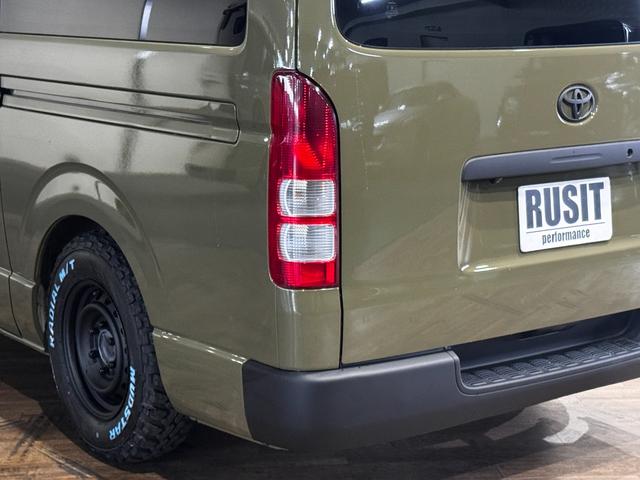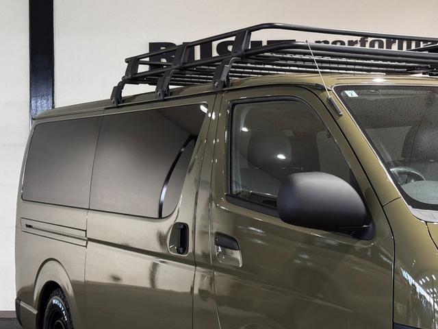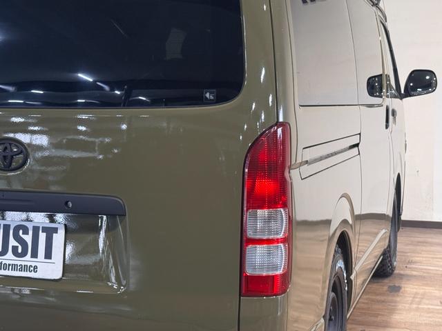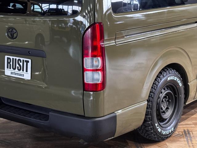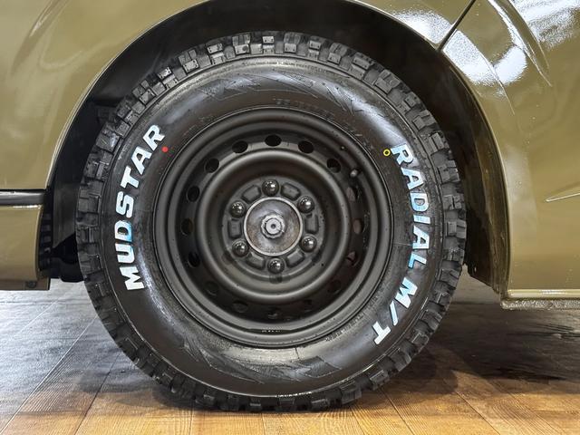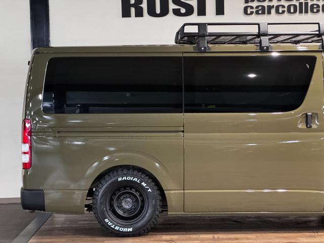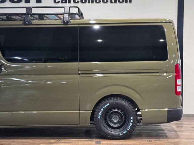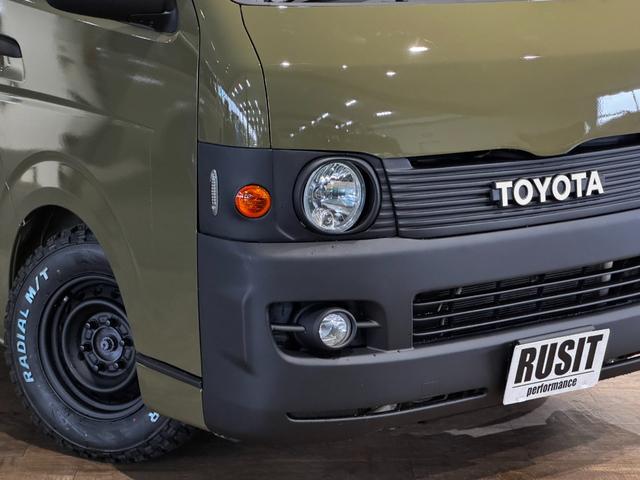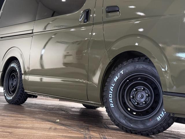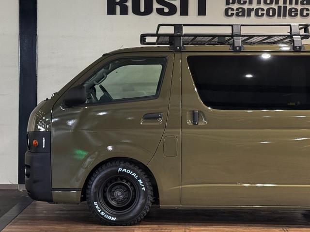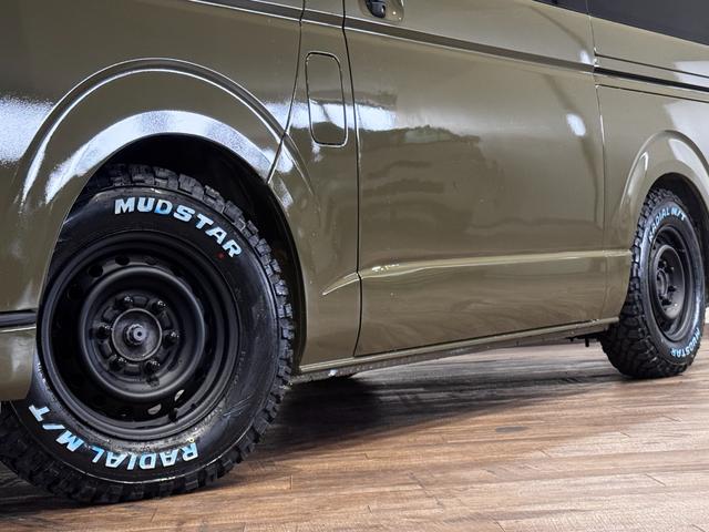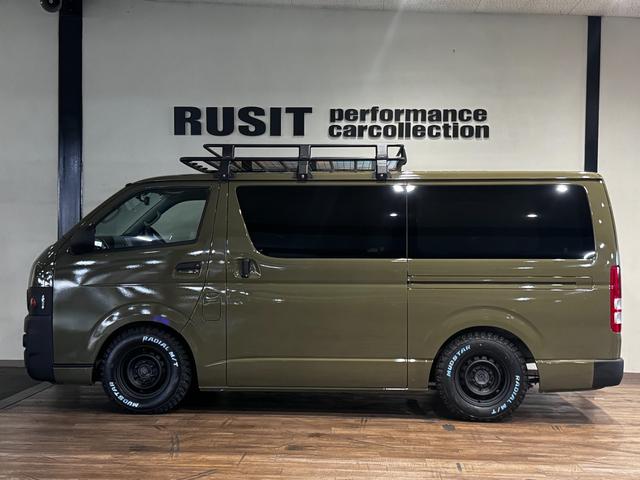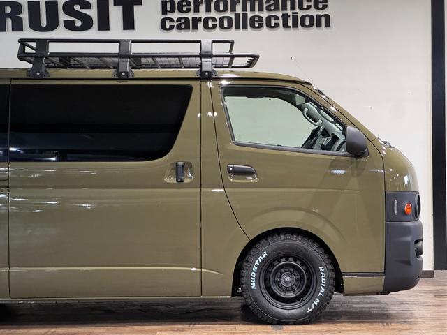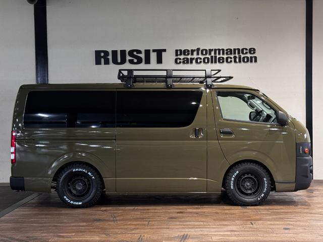 トヨタ ハイエースバンロングスーパーGL イエローオリーブカラー全塗装済み 丸目ヘッドライトカスタム シートカバー RADIAL M/T新品タイヤ 木目調シート ルーフキャリア リアエアコン付き ETC バックカメラ