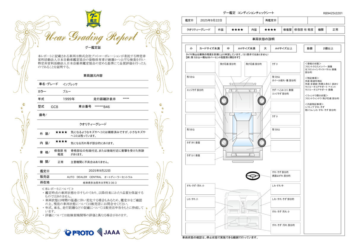 【鑑定済】キズ、凹み、修復歴を積極的に公開しております。客観的な声が聞きたいというニーズにお応えするため、第三者機関の鑑定表を公開しております。ご確認ください。(ディーラー車のみ)【査定表】