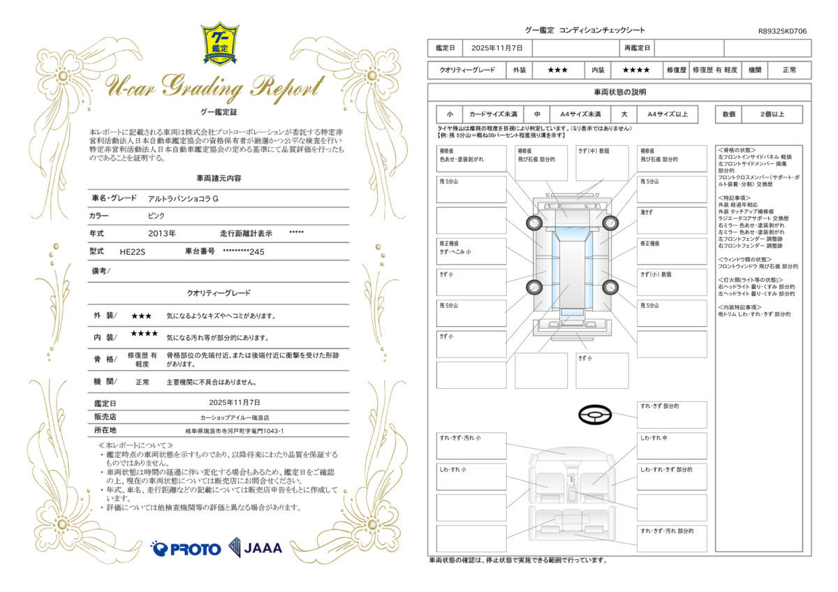 | 走行距離 | 2.1万km | 修復歴 | あり |