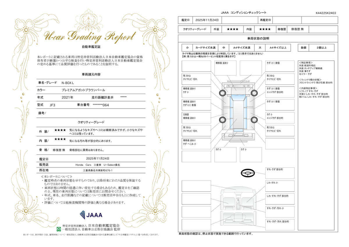 | 法定整備について | 今までの走行距離や使用状況を見て、お客様に安心してお乗りいただけるよう、法定点検項目およびHonda U-Select Webで定めている基準を元に整備され納車しております! |