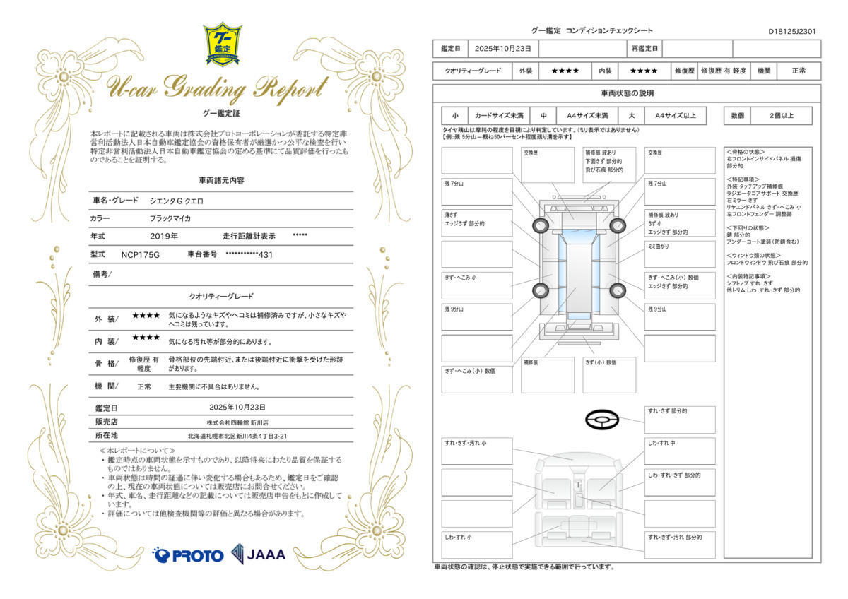 車両状態を日本自動車鑑定協会査定員の方に査定頂き鑑定書を発行、納車時にお客様にお渡ししております。