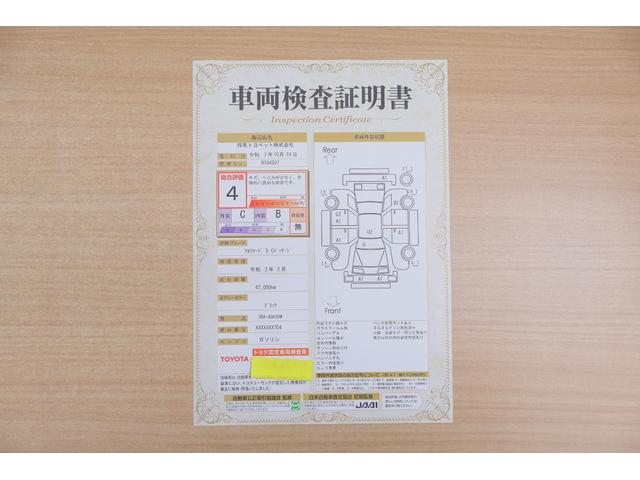 店頭にて、クルマの状態が一目で分かる検査証明書を公開中。トヨタ認定検査員が厳しく査定し、状態を点数と図解で表示しています。修復歴はもちろん、傷やヘコミの箇所や程度がご確認いただけます。