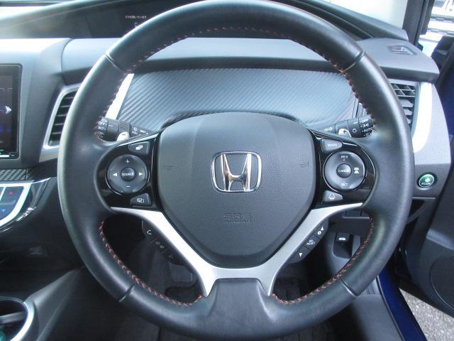 見た目も握り心地も豪華な革巻ステアリングも装備!ナビに連動したオーディオスイッチや高速走行時に役立つレーダークルコンも装備しています!