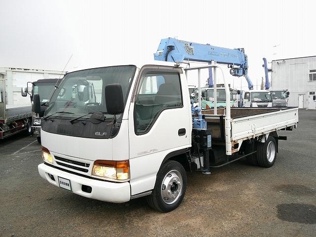 いすゞ エルフトラック クレーン付平ボディ 上物タダノ製 5段ブーム ラジコン付(無線) 2.6t吊 フックイン 積載3t 荷台寸352×208×38 荷台床鉄板張り ワイドロングボディ アオリサポート付き