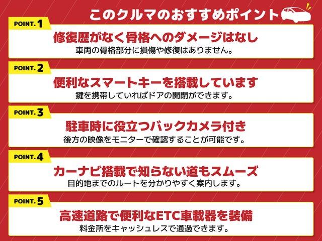 1.修復歴がなく骨格へのダメージはなし、2.便利なスマートキーを搭載しています、3.駐車時に役立つバックカメラ付き、4.カーナビ搭載で知らない道もスムーズ、5.高速道路で便利なETC車載器を装備