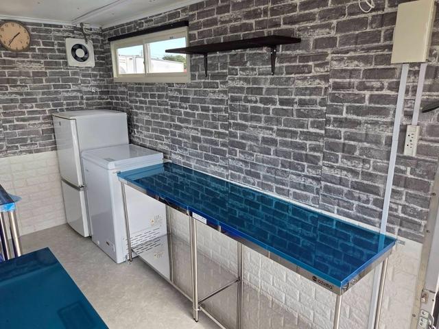 冷凍ストッカー 冷蔵庫 ステンレス作業用テーブル3台 換気扇 外部入力電源 LEDスポットライト&蛍光灯 右サイド小窓 ブレーカー&100Vコンセント2口×3ヶ所