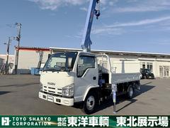 いすゞ エルフトラック PGクレーン付き平ボディ 上物タダノクレーン 3段ブーム フックイン 2.3t吊り 荷台寸法372x180x37 荷台床鉄板&板張り 積載2.4t 極東製 跳上パワーゲート付 PGリモコン付