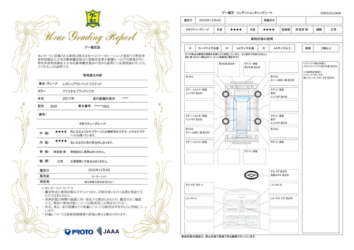 | 法定整備について | 法定点検整備12ヶ月点検を実施し、点検記録簿が発行されます。 |