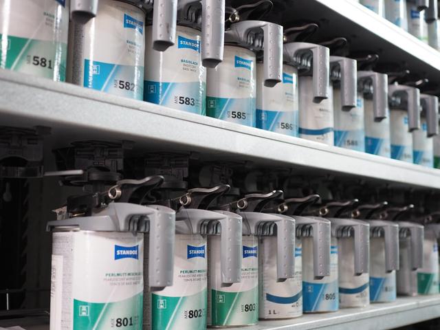 自社塗装ブースで使用している塗料は【STANDOX】です。ディーラーでも使用している塗料です!パール系やメタリックにも対応可能!仕上がりに自信があります!