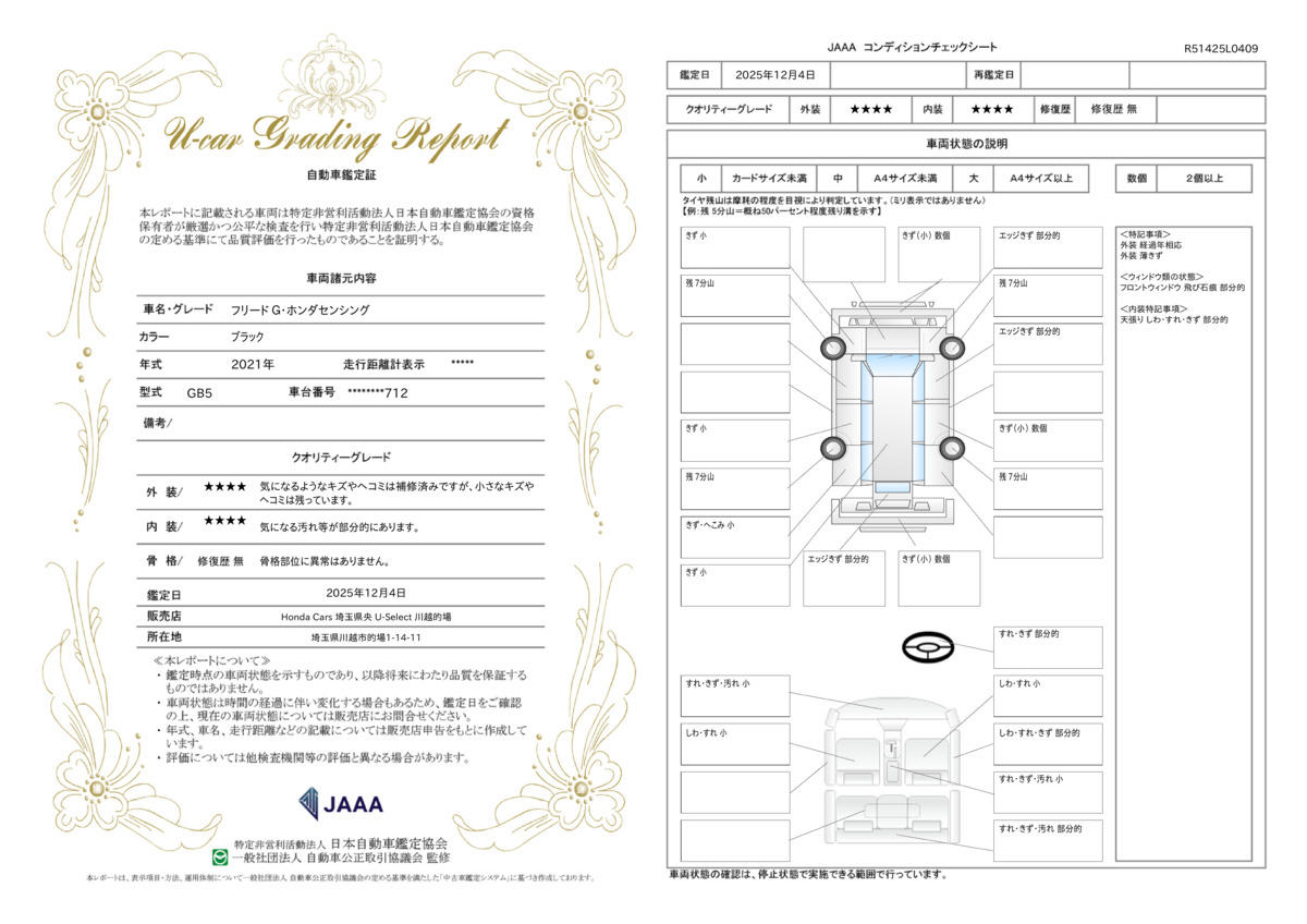 外装・内装・機関・修復歴の4項目について鑑定いたします