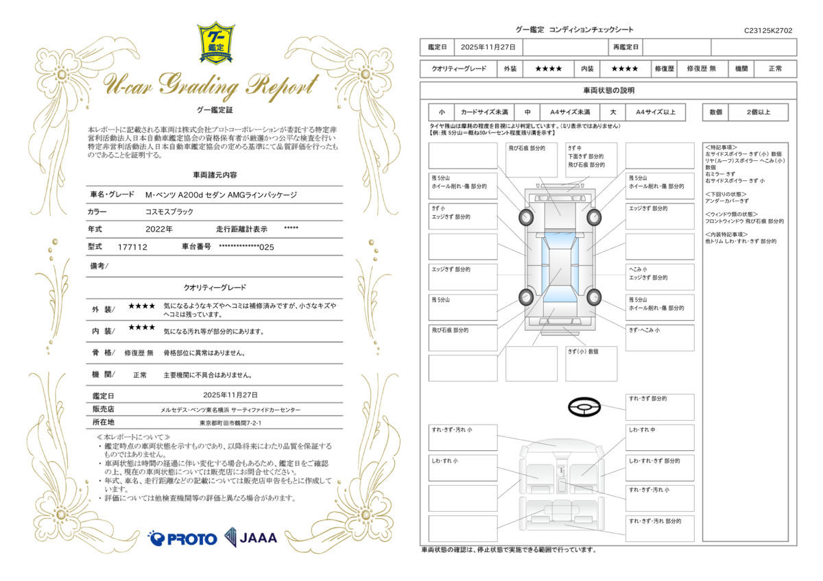 | 内容 | ●2年保証(走行距離無制限):純正部品の材料または製造上の不具合が発生した場合、無償修理を実施(消耗部品や油脂類、内外装は除く)。全国のメルセデス・ベンツ正規サービスネットワークでご利用いただけます |