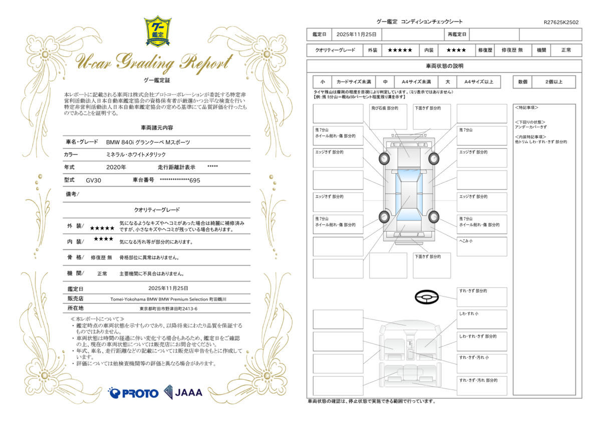 弊社在庫車両はすべて、入庫段階での客観的且つ厳正な車両チェック(第3者機関日本査定協会による査定)を実施しております。メーター改ざん車、修復歴車などは一切ございませんので、どうぞご安心くださいませ。