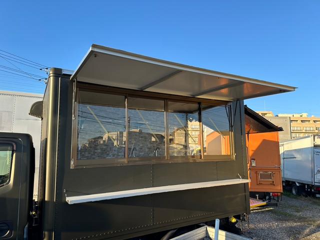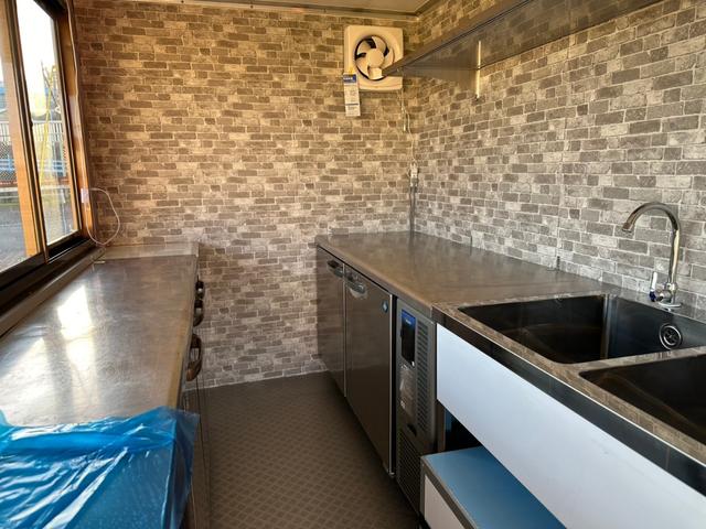 キッチンカー 冷蔵庫*2☆給排水水タンク各200L☆2槽シンク☆手洗いシンク☆作業台☆壁付平棚☆換気扇 ★バックモニター☆跳ね上げ式ハッチ・折畳みカウンターテーブル☆100V外部電源口☆照明