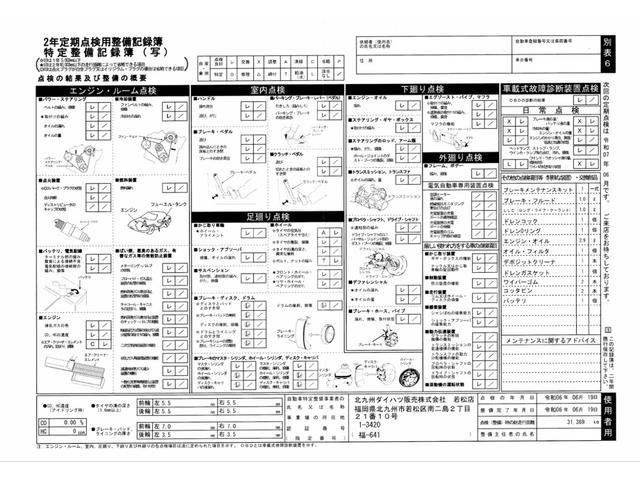 プランA法定点検整備・消耗品(EGオイル/エレメント、ブレーキパッド/オイル、ワイパー、補器ベルト、点火プラグ等の中で必要な箇所)の交換を行った後のご納車となります!総額に税金(未経過分)等も含みます