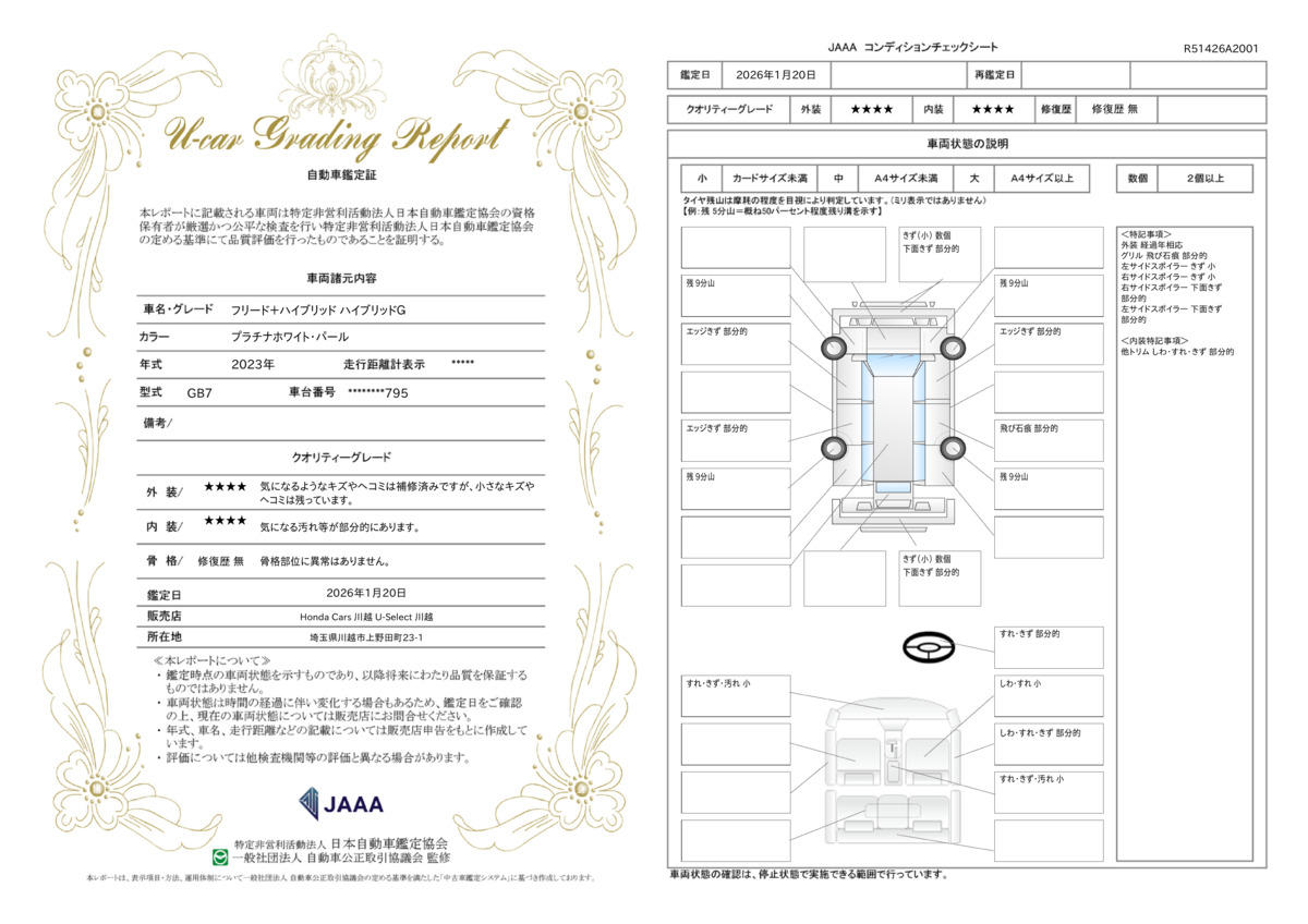 外装・内装・機関・修復歴の4項目について鑑定いたします