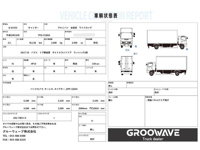 三菱ふそう キャンターアルミバン ワイドロング パブコ サイドドア リア観音扉 ラッシング2段 4,500×2,080×2,060 走行45千km 積載3t I5 5速 マニュアル バックカメラ キーレス