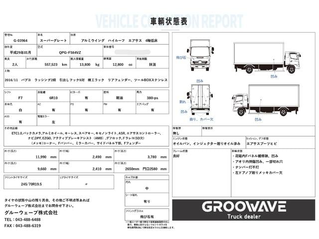 三菱ふそう スーパーグレートアルミウイング 4軸低床 エアサス ハイルーフ パブコ 9,660×2,410×2,650 ラッシング2段 引出しフック9対 積載13.8t アルミホイール F7 7速 マニュアル 大型ウイング メッキパーツ ETC1.0 バックカメラ