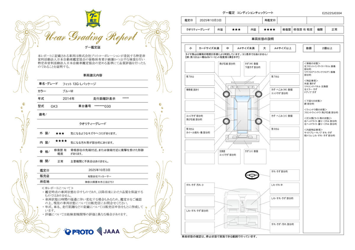 JAAA全車鑑定付です!!車両の状態、走行距離、事故等など、JAAA管理システムにより、一目でお客様に分かりやすい様に、鑑定書もお渡ししています。安心で低価格な車両を是非見つけて頂ければと思います。