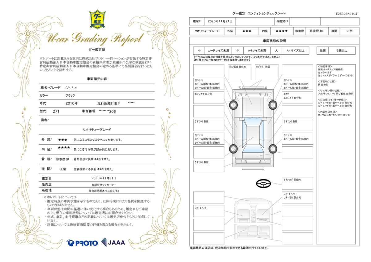 JAAA全車鑑定付です!!車両の状態、走行距離、事故等など、JAAA管理システムにより、一目でお客様に分かりやすい様に、鑑定書もお渡ししています。安心で低価格な車両を是非見つけて頂ければと思います。