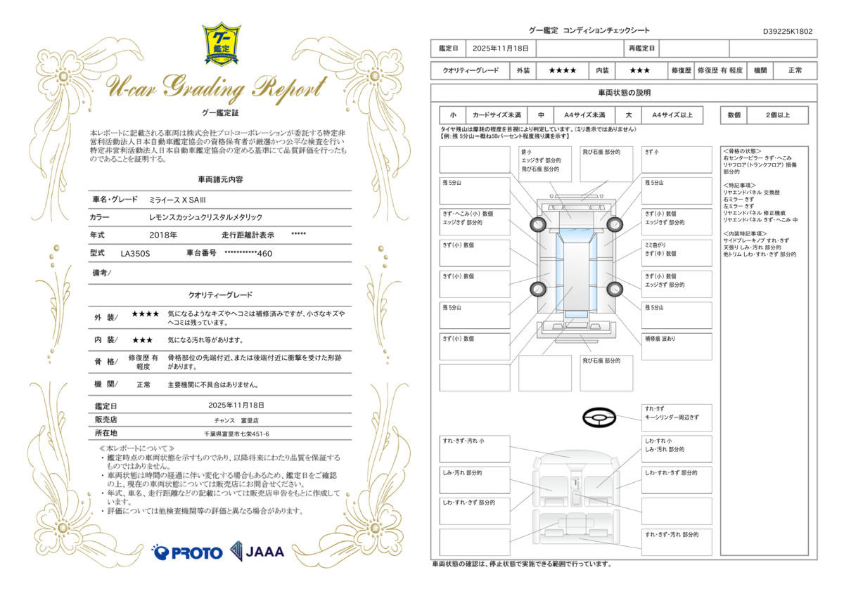 ☆チャンスの魅力5☆ 第三者機関による鑑定書付き!第三者である鑑定士が一台一台鑑定し、第三者だからこそ出来る公正な評価がつきます。修復歴は勿論、わずかな傷でも鑑定書にて、確認して頂けます。