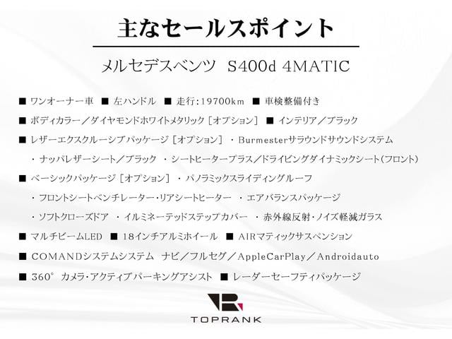 S400d 4マチック 左H レザーエクスクルーシブ&ベーシックPKG パノラマSR ナッパレザー シートクーラー/ヒーター Burmester 360度カメラ レーダーセーフティ 1オーナー 走行19700km 車検整備付