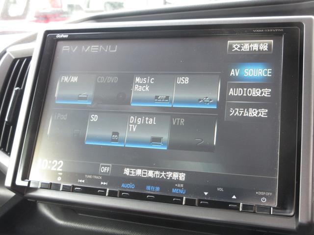 ナビゲーションはギャザズメモリーナビ(VXM-135VFNi)を装着しております。AM、FM、CD、DVD再生、Bluetooth、音楽録音再生、フルセグTVがご使用いただけます。