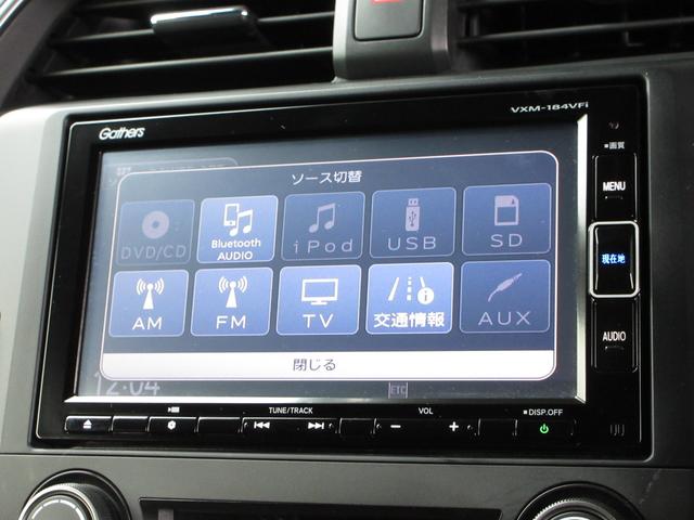 ナビゲーションはギャザズメモリーナビ(VXM-184VFi)を装着しております。AM、FM、CD、DVD再生、Bluetooth、フルセグTVがご使用いただけます。