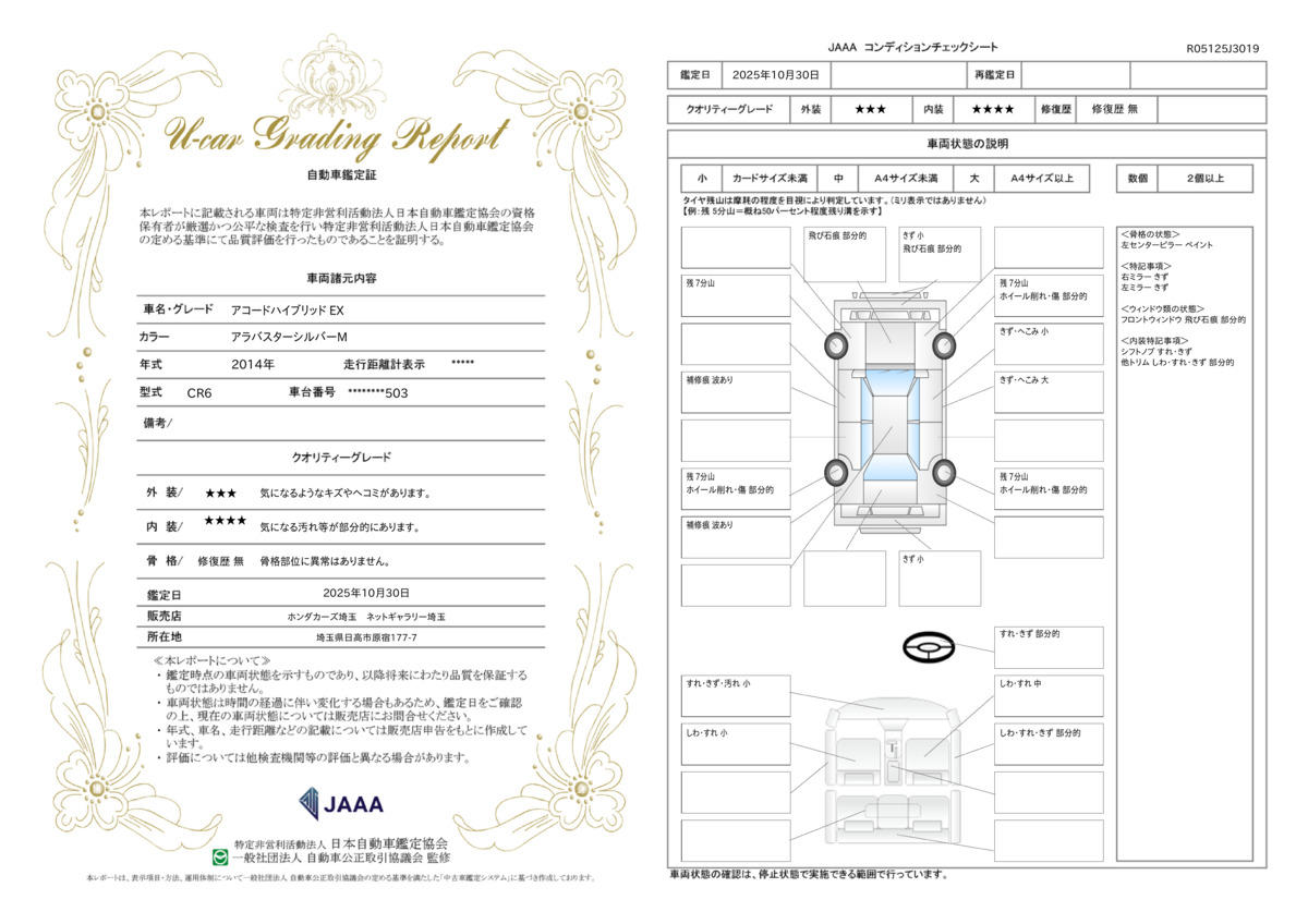 Honda認定中古車で修復歴がない事、さらに第三者機関の車両状態証明書をすべての車両で取得してます。