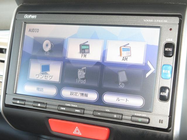 ナビゲーションはギャザズメモリーナビ(VXM-174CSi)を装着しております。AM、FM、CD、Bluetooth、ワンセグTVがご使用いただけます。初めて訪れた場所でも安心ですね!
