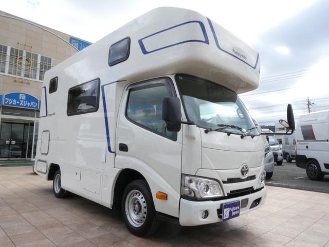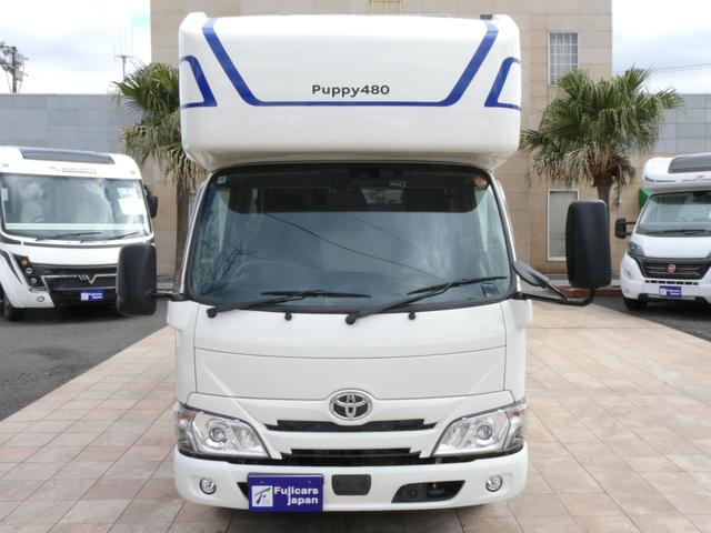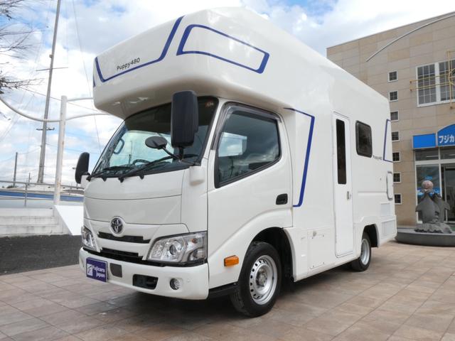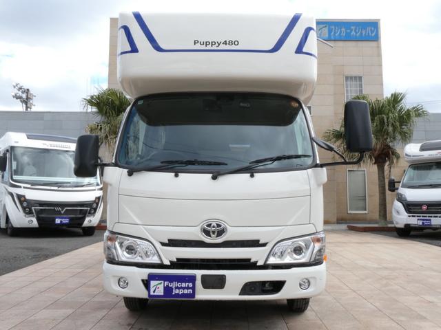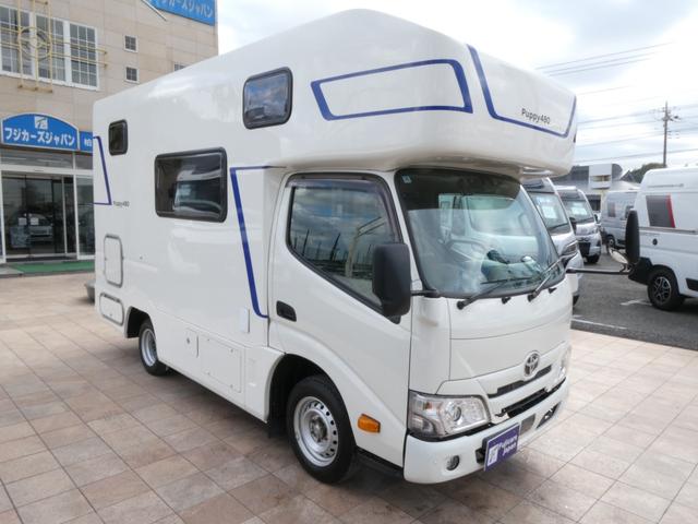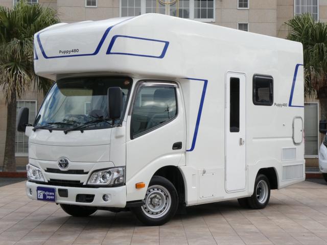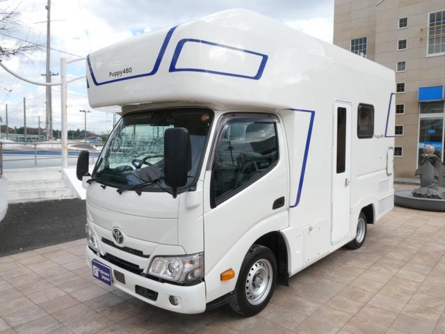 トヨタ カムロードキャンパー厚木 パピー480 キャンピングカー 8ナンバー 家庭用エアコン ソーラーパネル4枚 鉛バッテリー3個 走行充電 外部充電 インバーター1500W FFヒーター マックスファン シンク テレビ 冷蔵庫 電子レンジ トイレ