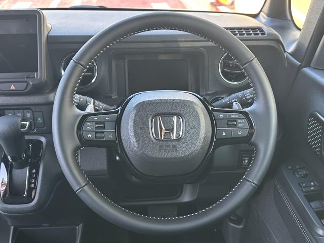 ホンダ N-BOXカスタムターボコーディネートスタイル フォグランプ付き スマートキー LEDヘッドライト 両側パワースライドドア フルオートエアコン シートヒーター ロールサンシェード シートバックテーブル 革巻きハンドル パドルシフト 届出済未使用車