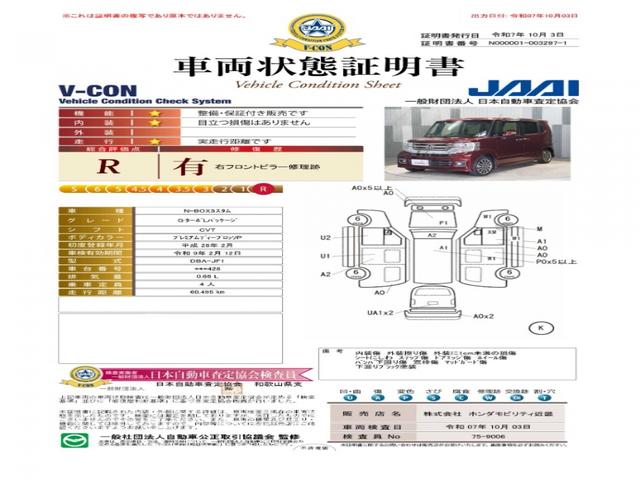 【車両状態証明書】修復歴や板金塗装跡の有無はもちろん、車両図を見ながら傷や凹みも実車で確認でき安心してご購入いただけます。