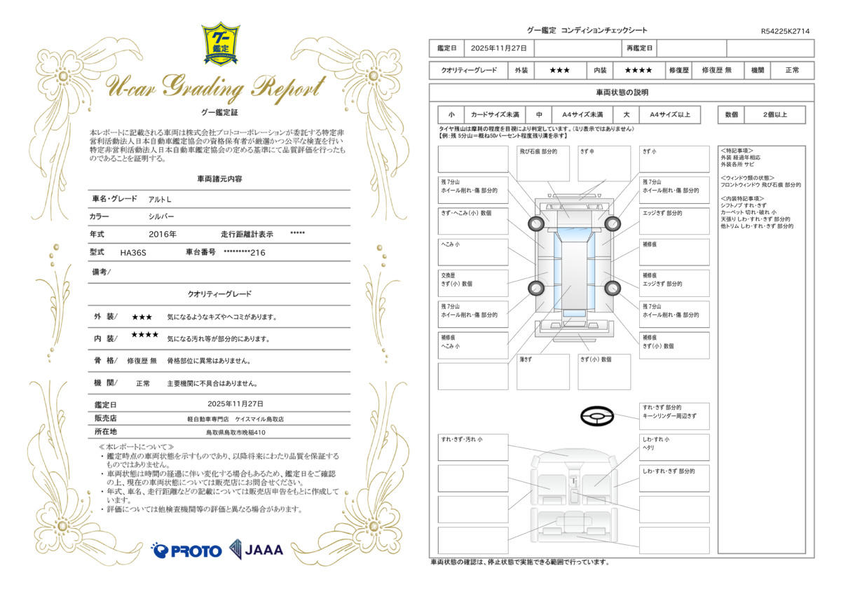 | 走行距離 | 6.8万km | 修復歴 | なし |