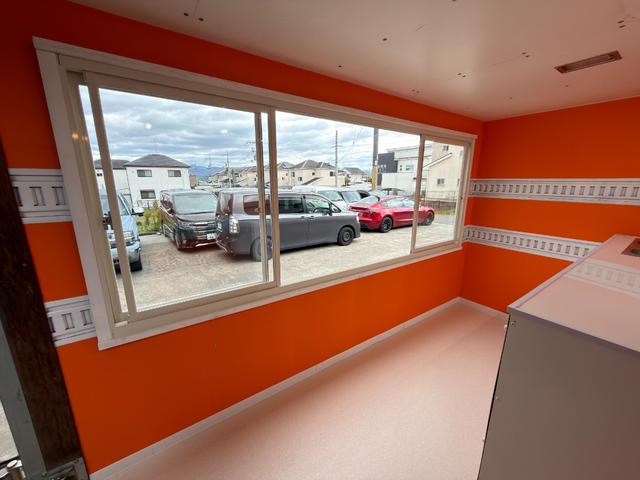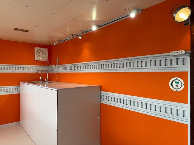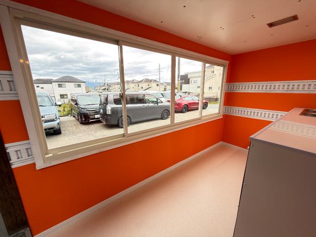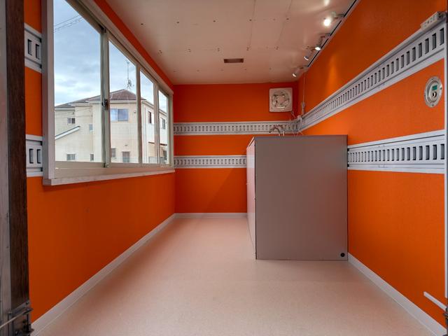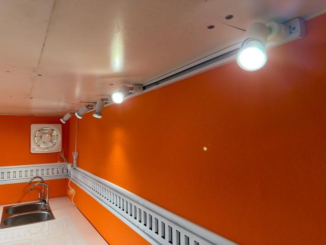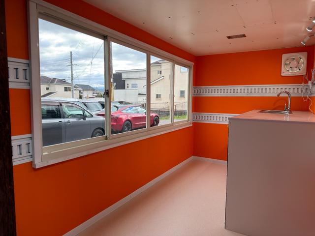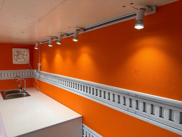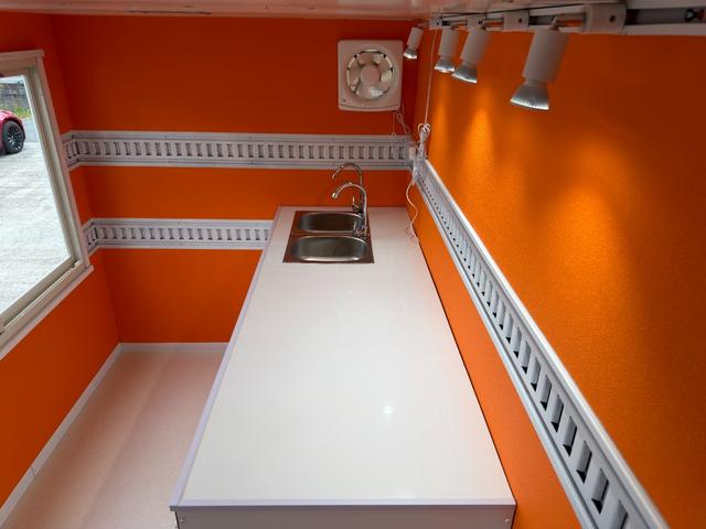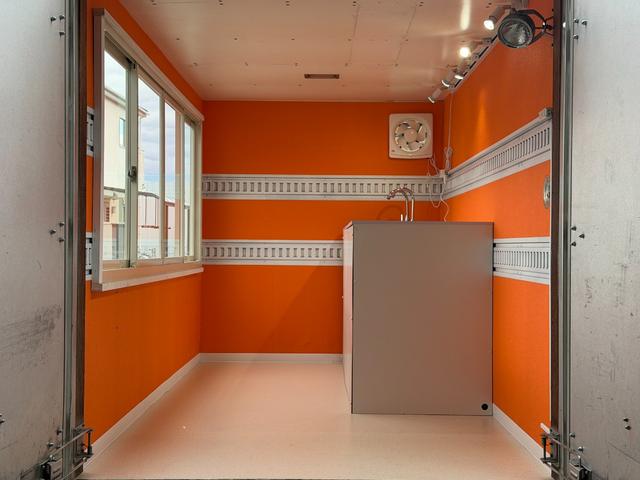 キッチンカー仕様 W2600XH970アルミサッシ窓 Wシンク内新品200L給排水タンク 新品電動給水ポンプ レール式LEDスポットライト 新品換気扇カバー付属 新品フロアー張替え施工 オレンジ壁 リフォーム後未使用