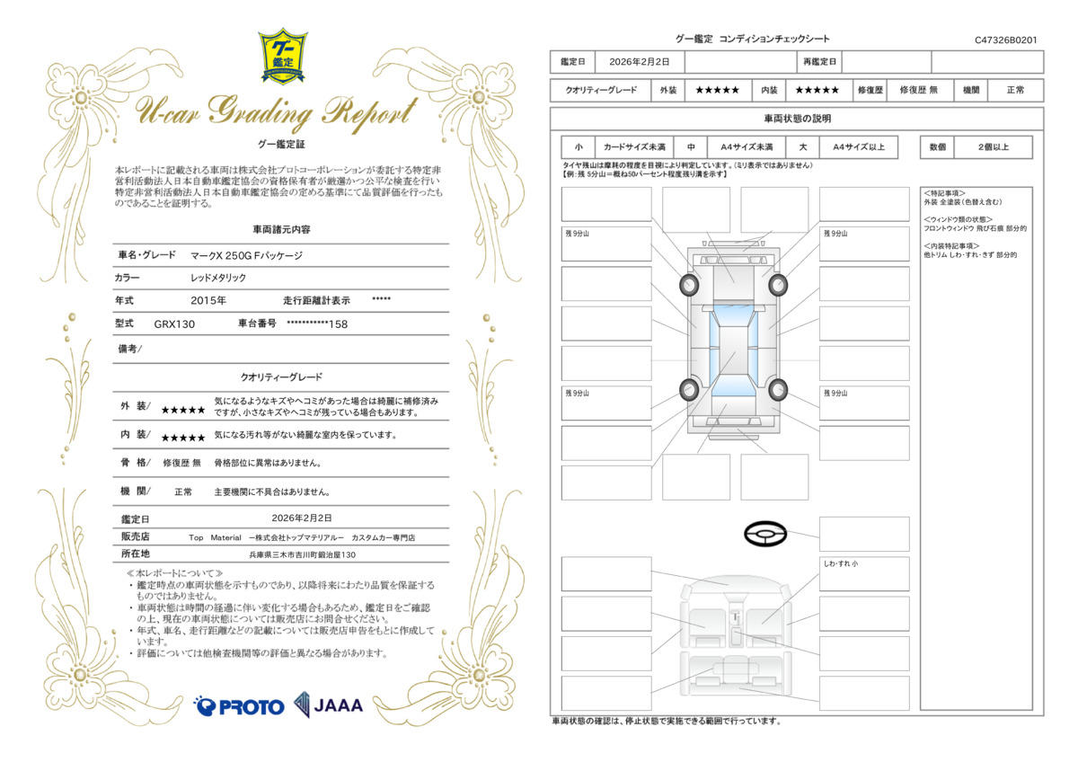 遠方のお客様にも安心して御購入頂けますよう、当車両は、仕入れ時の査定後、更に第三者機関によるNPO法人JAAA日本自動車鑑定協会による鑑定を受けており、機関、内外装の高評価を得ております。